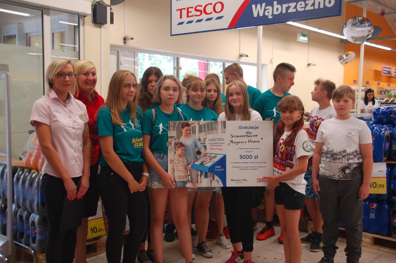 Z tego powodu, mieliśmy zaszczyt odebrać nagrodę dla wygranego projektu - czek w wysokości 5 tys. złotych. Sytuacja ta, miała miejsce 12 lipca w wąbrzeskim Tesco. Wszyscy niezmiernie się cieszyli, dumnie reprezentowali "Piotrusia Pana" w miejskiej telewizji kablowej.
